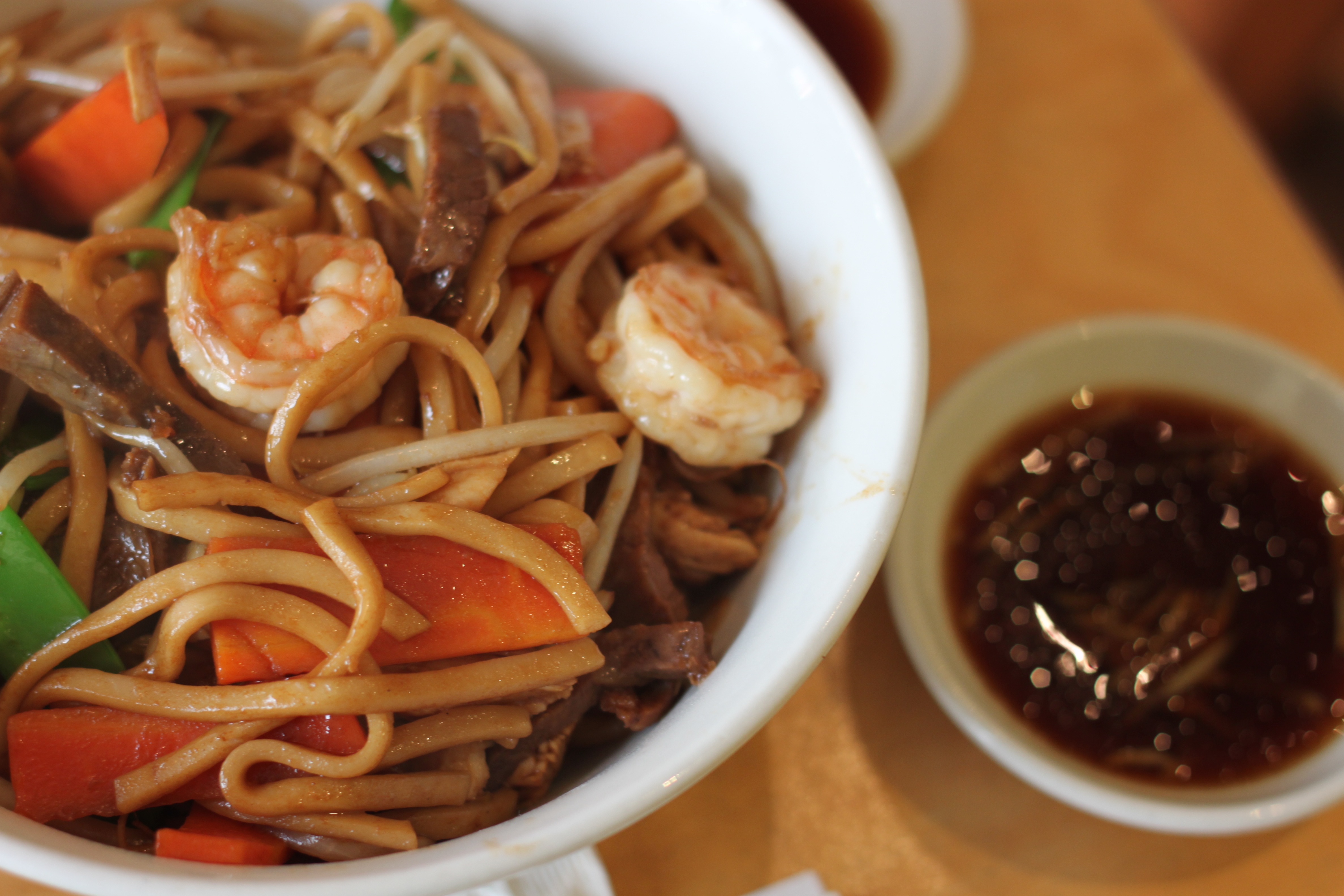 We shared a bowl of chao mian with prawns, beef, and chicken and also a selection of their dumplings. The xiao long bao were unfortunately not up to Din Tai Fung standards, but the shrimp wontons and grilled pork and Chinese leaves dumplings were phenomenal. The prices were reasonable, especially considering the location, and the noodle portion was more than generous.