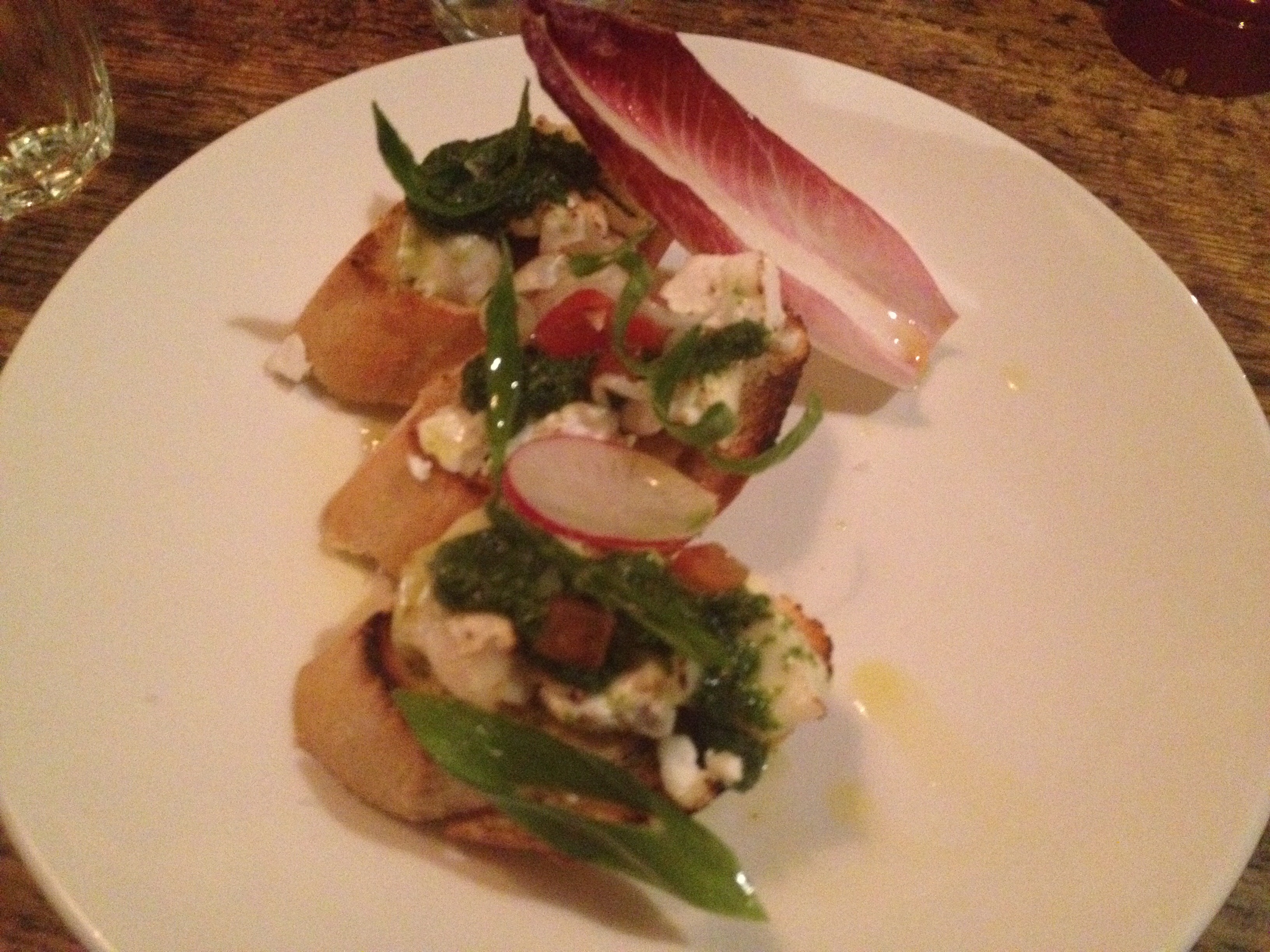 Ashley and I got a last minute table on a Tuesday night and went in with extremely high expectations. Possibly too high of expectations, but I’ll address that later. We shared four dishes: pressed pig’s ear, duck ham with quince and walnuts, calf’s brains with brown butter and capers, and foie gras and duck liver toast. The standout dish of the night was the duck ham, dried and cured duck breast made in the style of prosciutto. The crunchy walnuts and sweet quince were a perfect accompaniment to the salty duck.