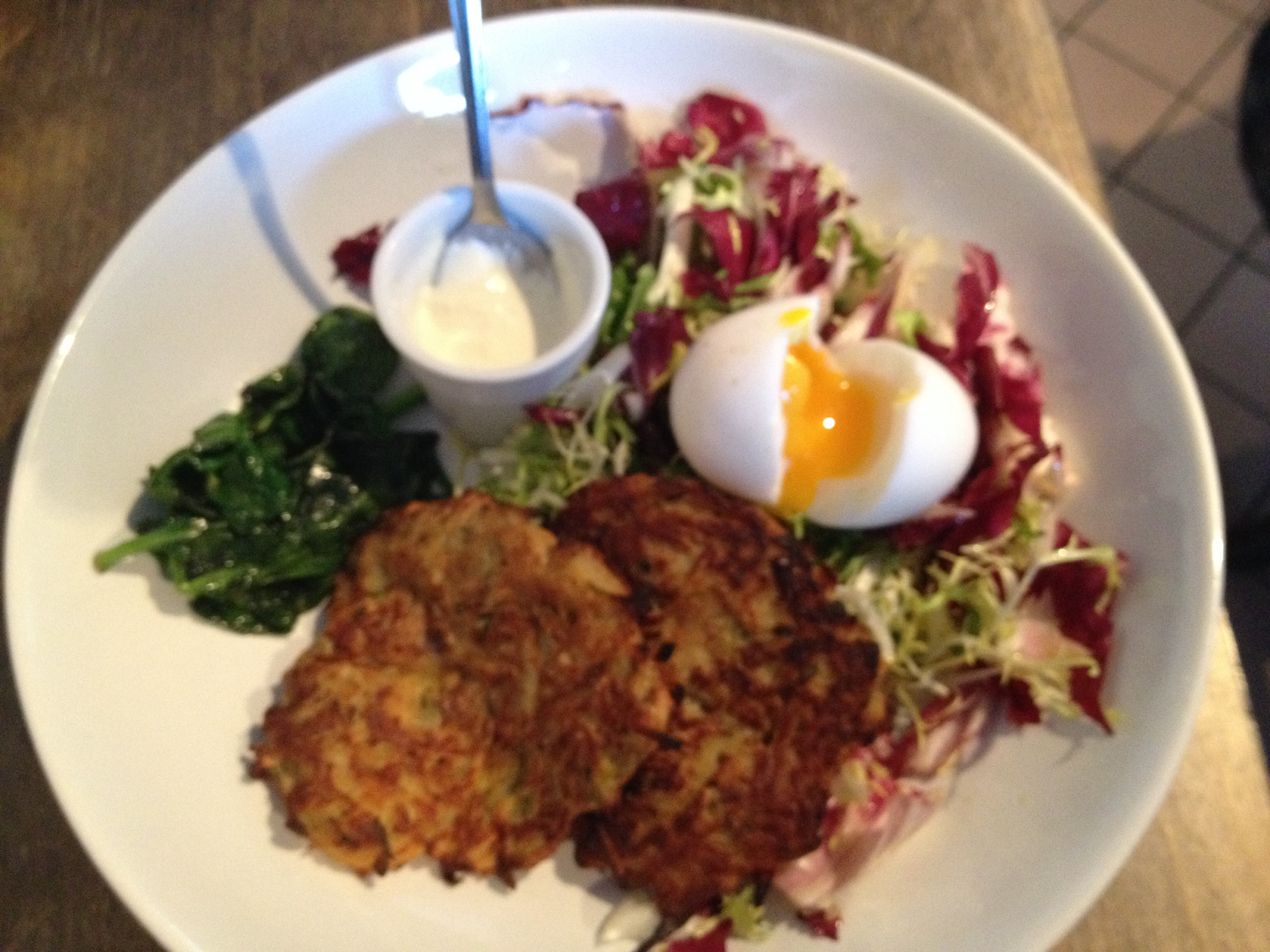 The menu changes often, with specials written on a big chalkboard on the wall. I had Jerusalem artichoke and celeriac fritters served with fried spinach, a poached egg, homemade horseradish, and a side salad. It was a simple dish done really well, one that let the freshness of the ingredients shine. I think The London Particular will become a New Cross staple for me.