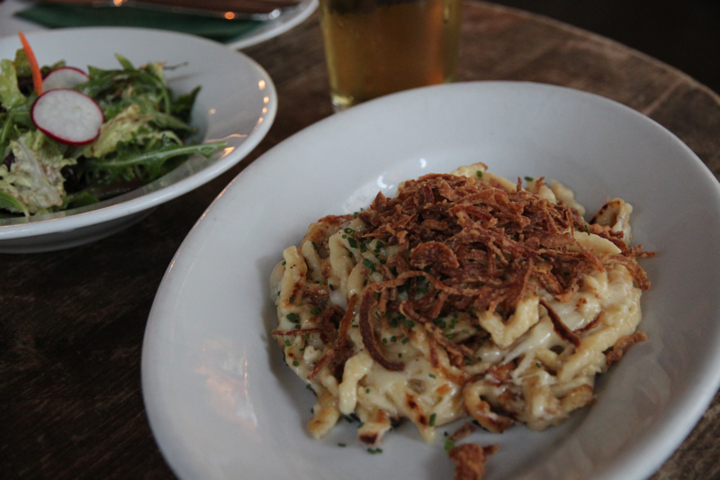 I went with Käsespätzle, a kind of casserole made cheese, browned onion, and spätzle, an kind of egg noodle-dumpling hybrid. This is an extremely rich dish, but washed down with a cold beer, it went down nicely. While it’s not exactly cheap, if you’re looking for some good Swabian food in a sea of Asian takeaway, kebab shops, and currywurst stands then Schwarzwaldstuben is probably one of your best bets.