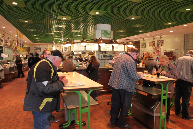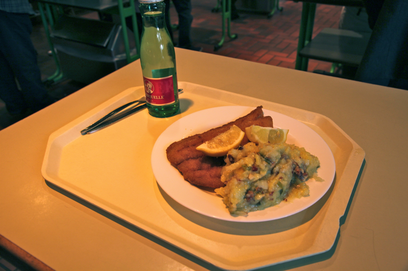 I didn’t come to shop, but for a self-service, cafeteria style lunch. I was planning on sausage, but decided to follow the cue of everyone else in front of me in line and ordered a piece of the fried fish and a side of potato salad filled with tiny pickles. The fish, pounded out and fried like schnitzel, was light but filling and considering the number of people passing through here even after lunch time, it’s a crowd pleaser.