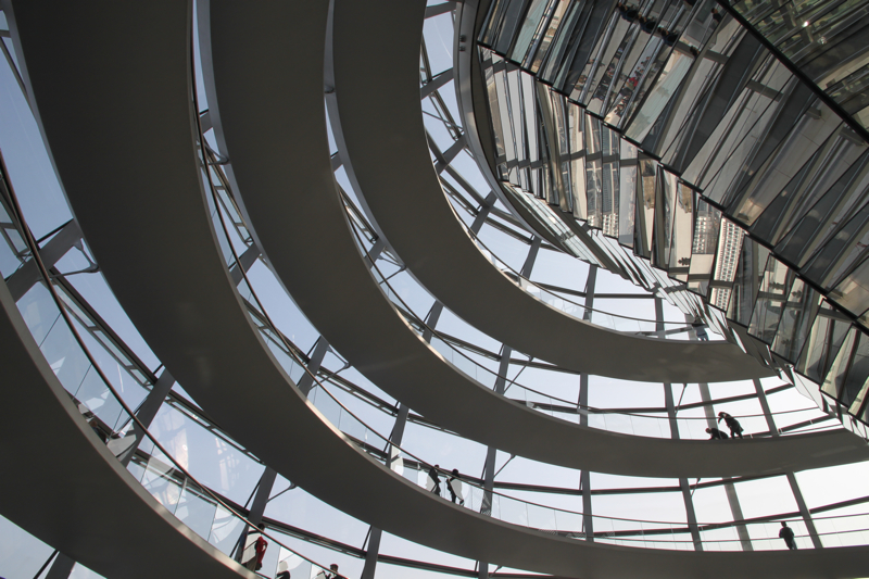 Today a large glass dome, open to the public, sits atop the building. This dome provides a 360 degree view of Berlin, as well as a view into the debating chamber of Parliament below. Norman Foster, the English architect behind the project, built the dome as symbol of a democratic and united Germany.