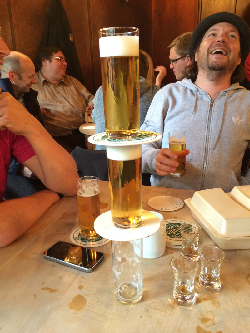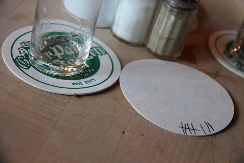 Then, not surprisingly, some shots of the this local Jagermeister showed up on our table. And more Kölsch kept coming. And finally, after a ridiculous amount of 20 centiliter glasses had been consumed, we decided we needed to leave to meet Kasey’s friends. We both put coasters on our glasses and waited for the waiter to come so we could settle the bill. The waiter came. And stacked more filled Kölsch glasses on top of the coasters. A breach of Kölsch protocol, I think.