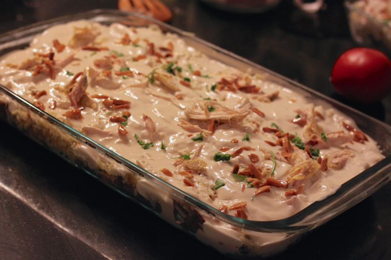 When Maria, the wonderful cooking instructor instructor at Beit Sitti, described fattet jaj I wasn’t sure what to expect. Yogurt isn’t once of my favorite foods, so I wasn’t sure how it would fit into a casserole of chicken, fried pita bread pieces, and rice. Turns out they go really, really well together and I found myself going in for a second helping of this simple but flavorful dish.