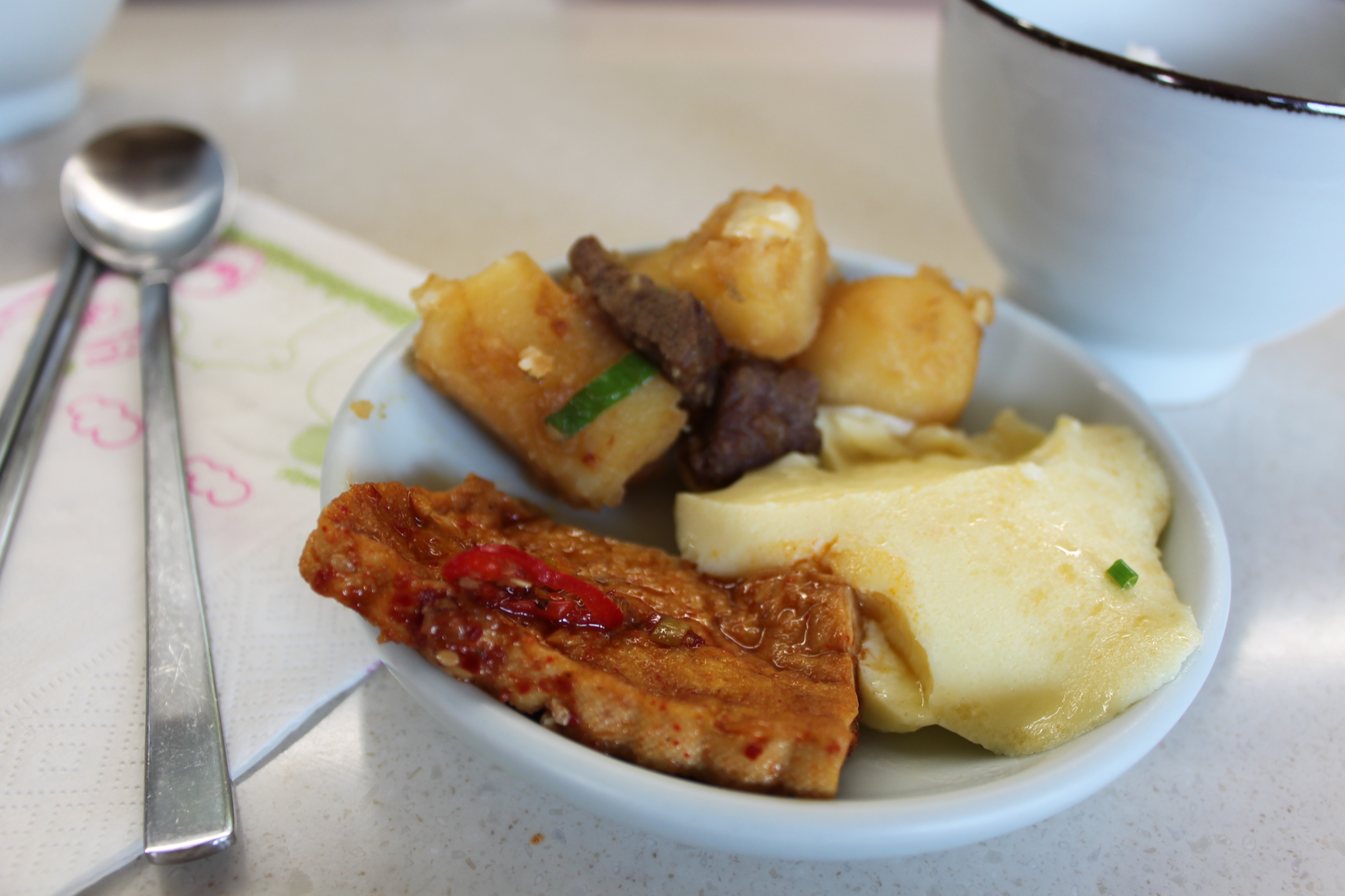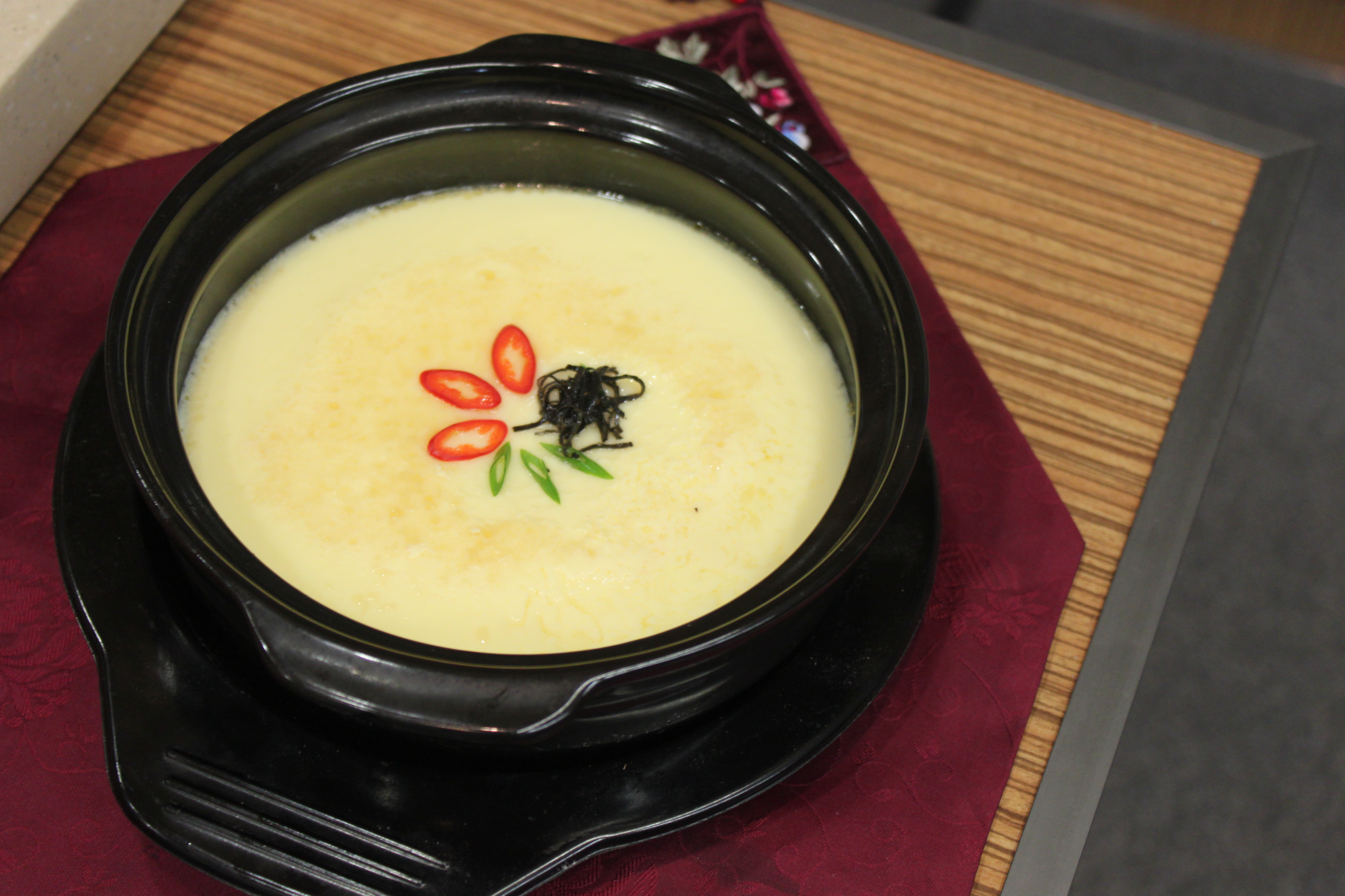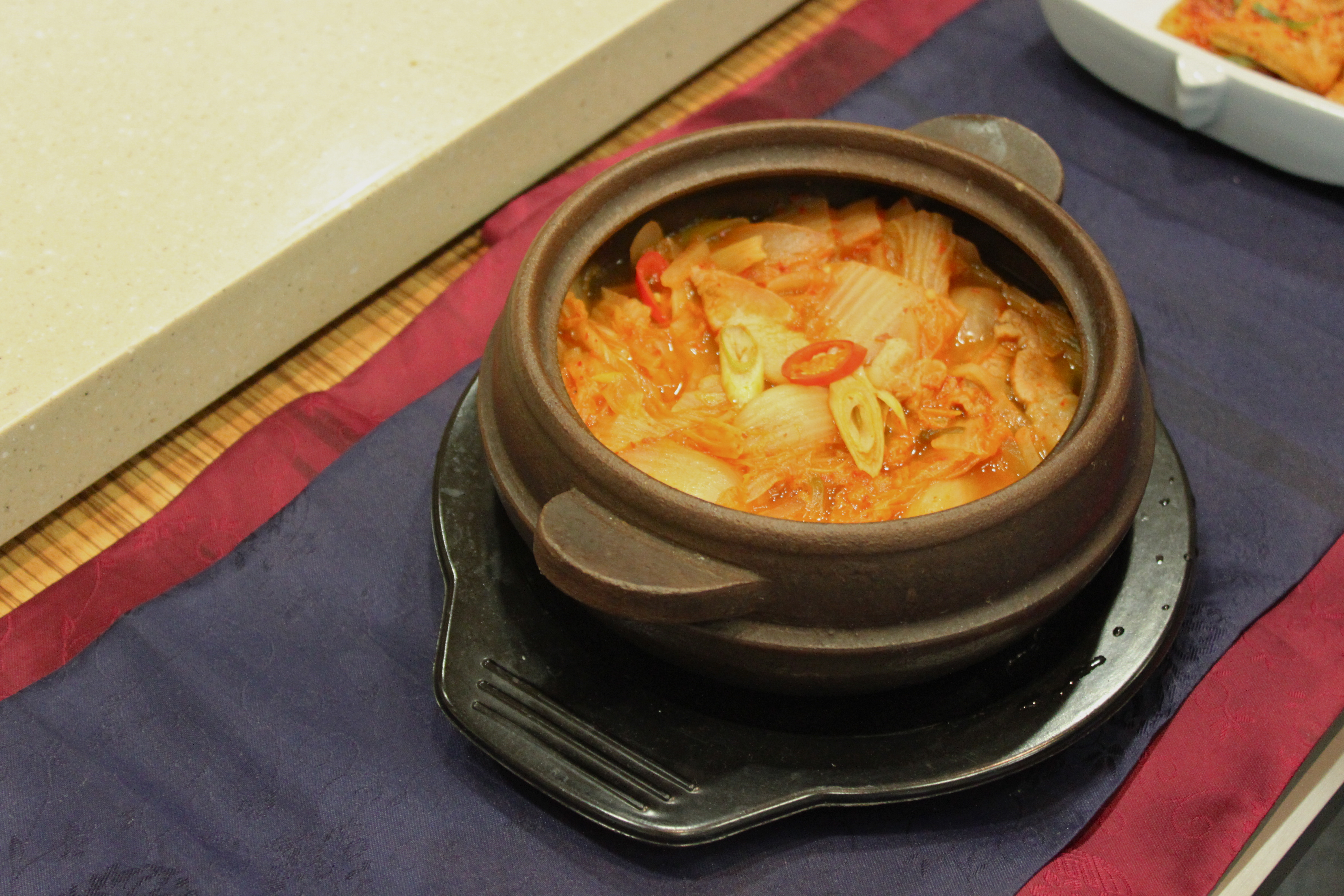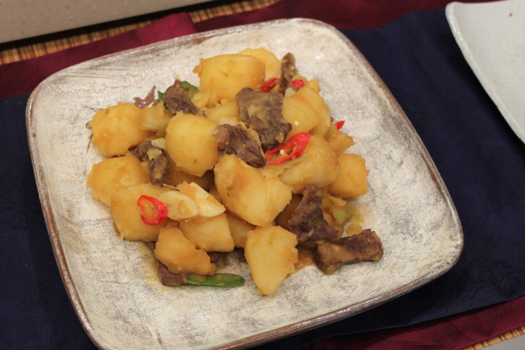 Doug, the translator and one of the assistants, came up behind me and demonstrated the correct way to hold the knife. The other assistants were flitting around the workspace, helping students as they needed it. Kasey was preparing her gamja sogogi jorim (braised potatoes and beef) solo, and the other two members of our group had the kimchi jjigae (kimchi stew) and dalkyalchim (egg souffle) under control by themselves.
