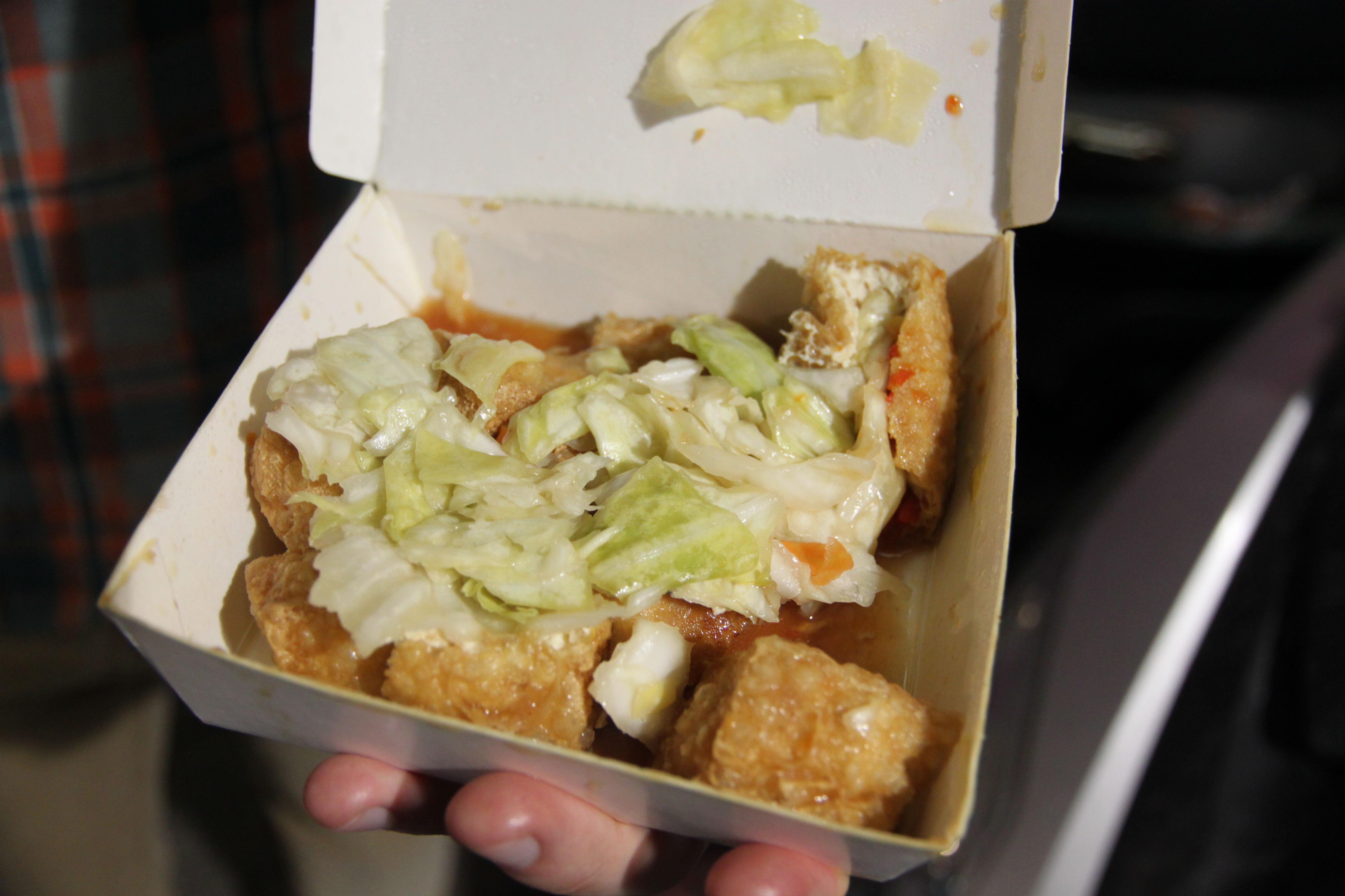 Next up we sampled what is probably Taiwan’s most infamous dish- stinky tofu. Stinky tofu has been fermented and the smell is, well, stinky. Not only does it have the aroma of dirty gym shoes combined with body odor, but the smell travels far and lingers for a long time. Surprisingly, you get used to it pretty quickly. And when the tofu is fried and smothered in spicy sauce in cabbage it actually tastes pretty good!