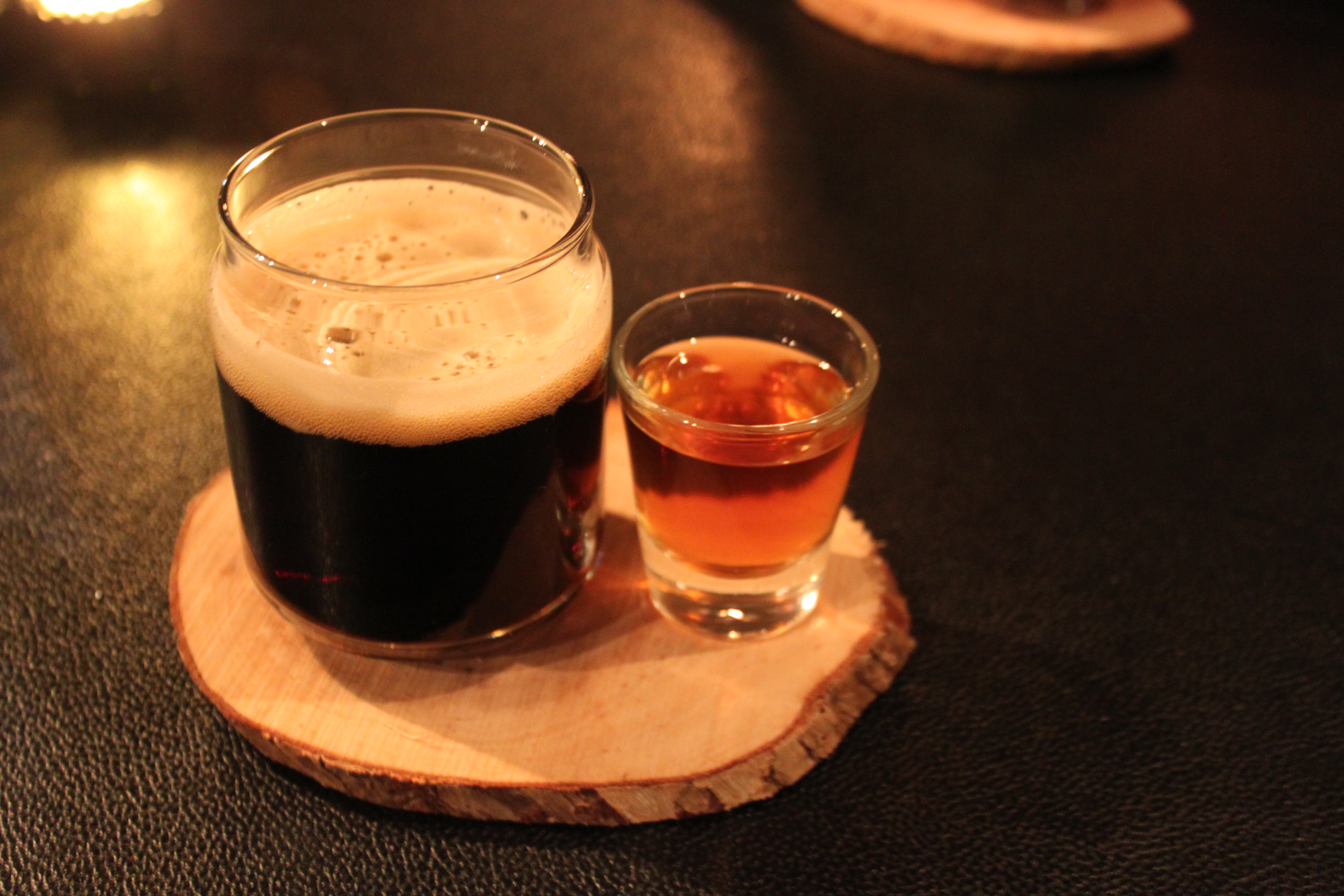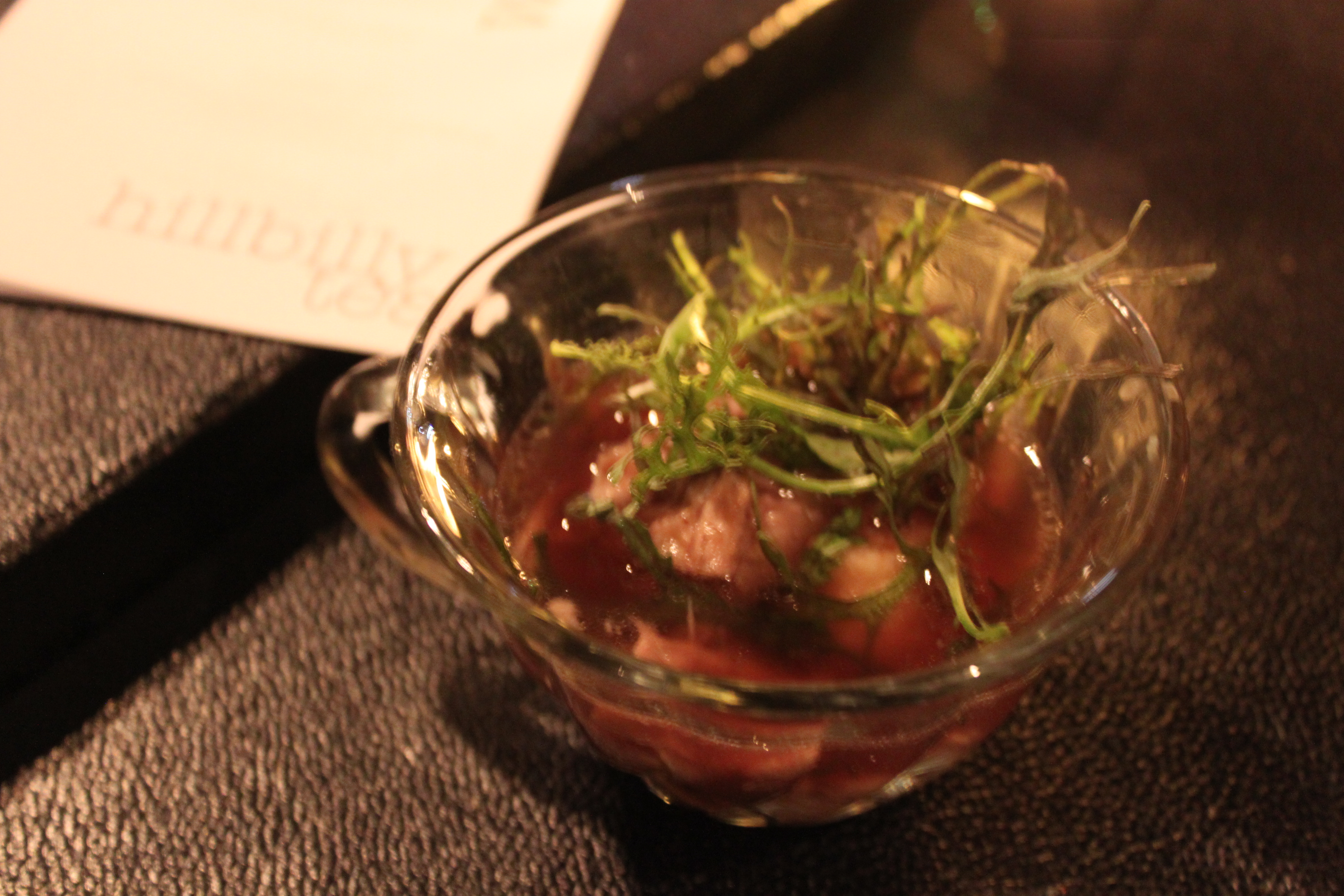 After a brief introduction to the meal and the restaurant, the first course was served. A teacup of braised pork with cream of wheat and cottage cheese dumplings in a tea broth was set in front of each diner. While the pork and dumplings were both seemingly perfect, the highlight of this course for me was the broth. Smoky, thick, and cloudy, it reminded me of my favorite ramen in Tokyo. While I could’ve happily drank the broth and had my thirst quenched, there was a special drink that accompanied this course- a boiler maker (a beer and a shot of whisky) done tea style. A small glass of Upland Brewery’s Bad Elmer’s Porter sat beside a shot glass of twig hooch, a homemade tea whisky, on a small slice of tree.