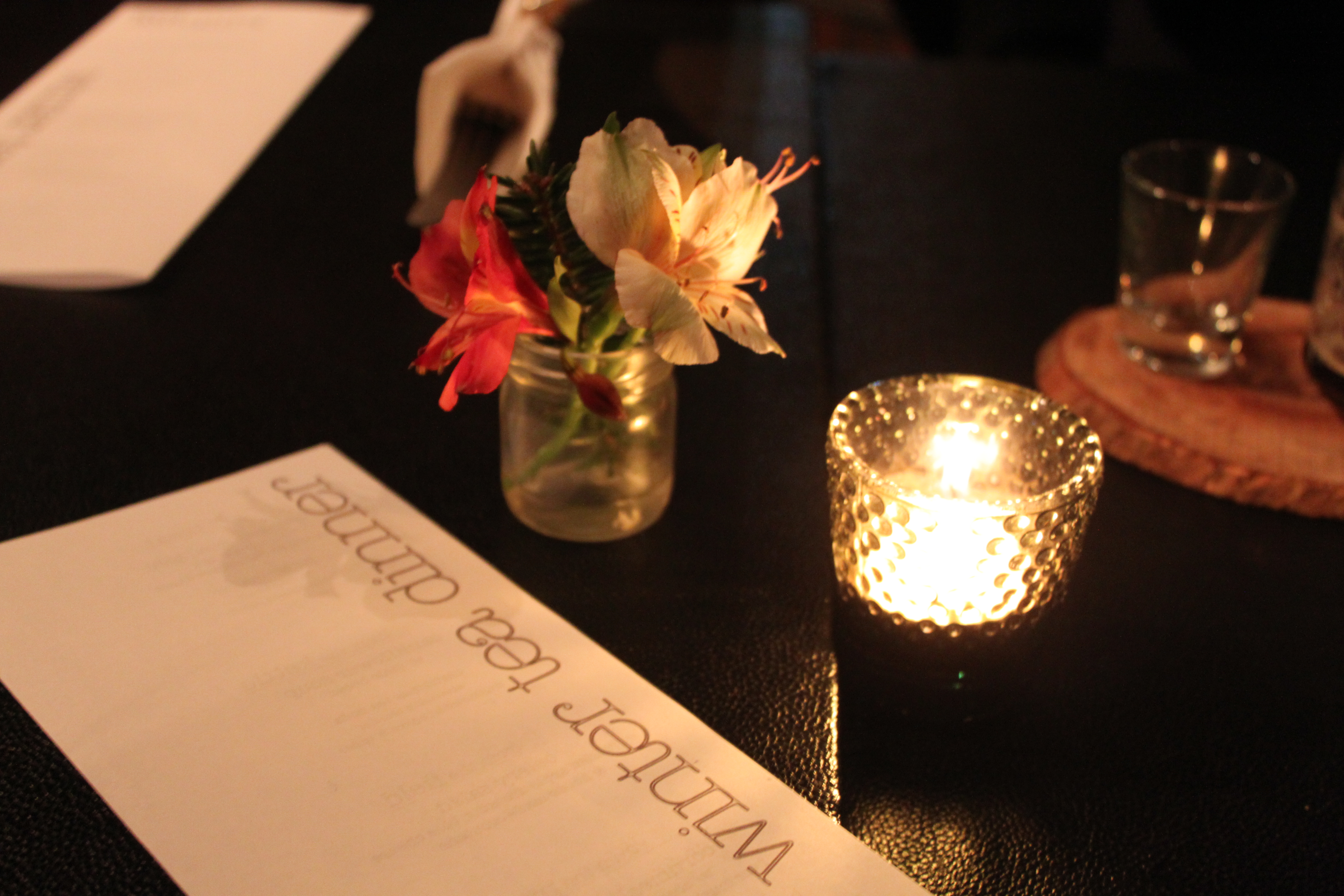 A few weeks later, appropriately scheduled on the night of the winter solstice, my family and I headed over to Hillbilly Tea’s rustic location in downtown Louisville. The dinner was a small, intimate affair with less than ten tables of appreciative foodies. Held upstairs, the dimly lit room, complete with the largest Christmas tree you’ve ever seen, was warm and cozy. An atmosphere to perfectly complement the theme of the dinner.