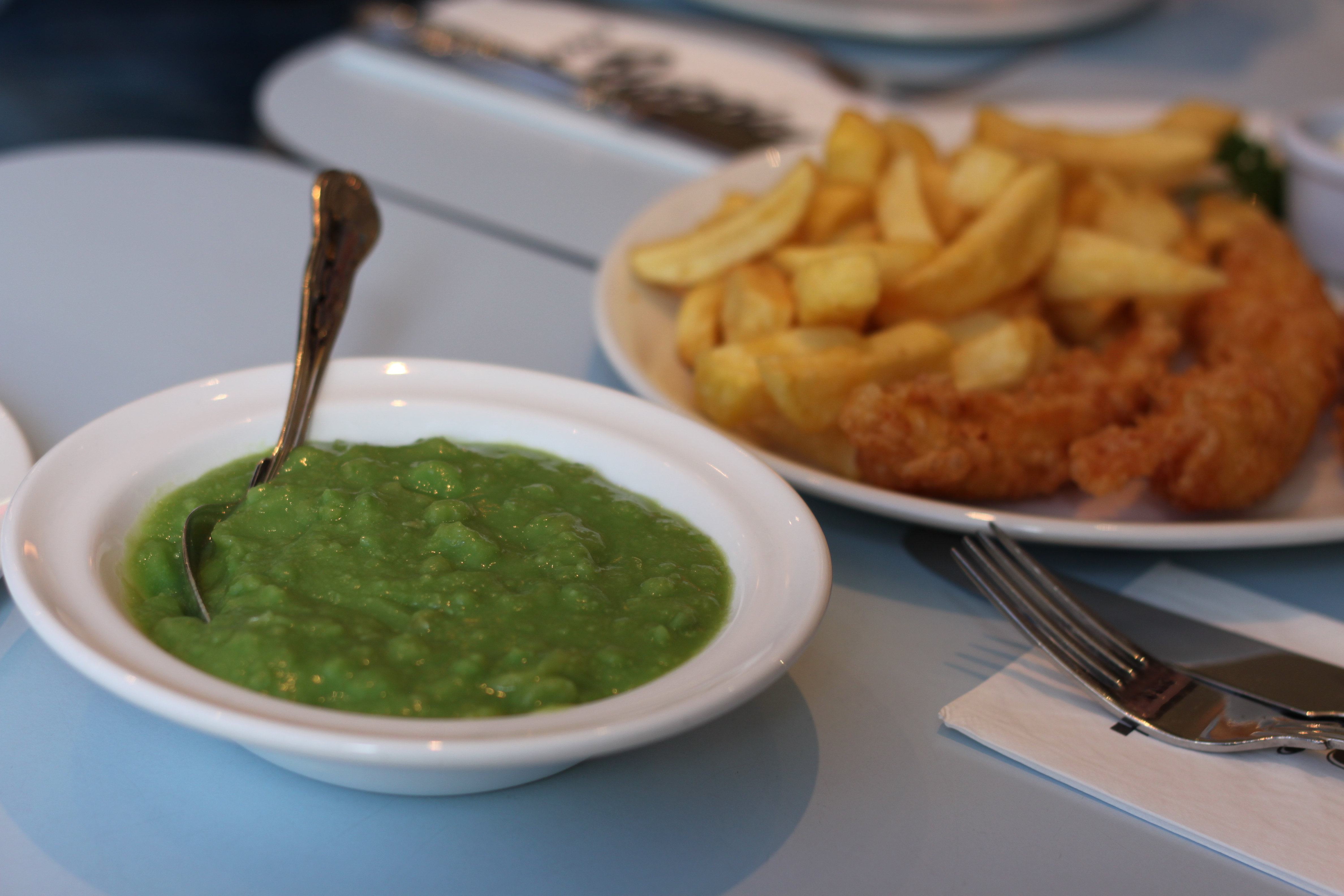 Before the tour began we were each asked what we were most looking forward to eating that day. My answer was fish and chips. Fish and chips is probably the most famous English dish in the States and I was excited to finally be trying it in its country of birth. The fish and chips (along with mushy peas- my favorite) at Poppies were a fantastic introduction. In a dining room reminiscent of a 1950s American diner I doused my plate with vinegar (as the English do, I’m told) and devoured some crispy battered Cod and even crispier fries chips.