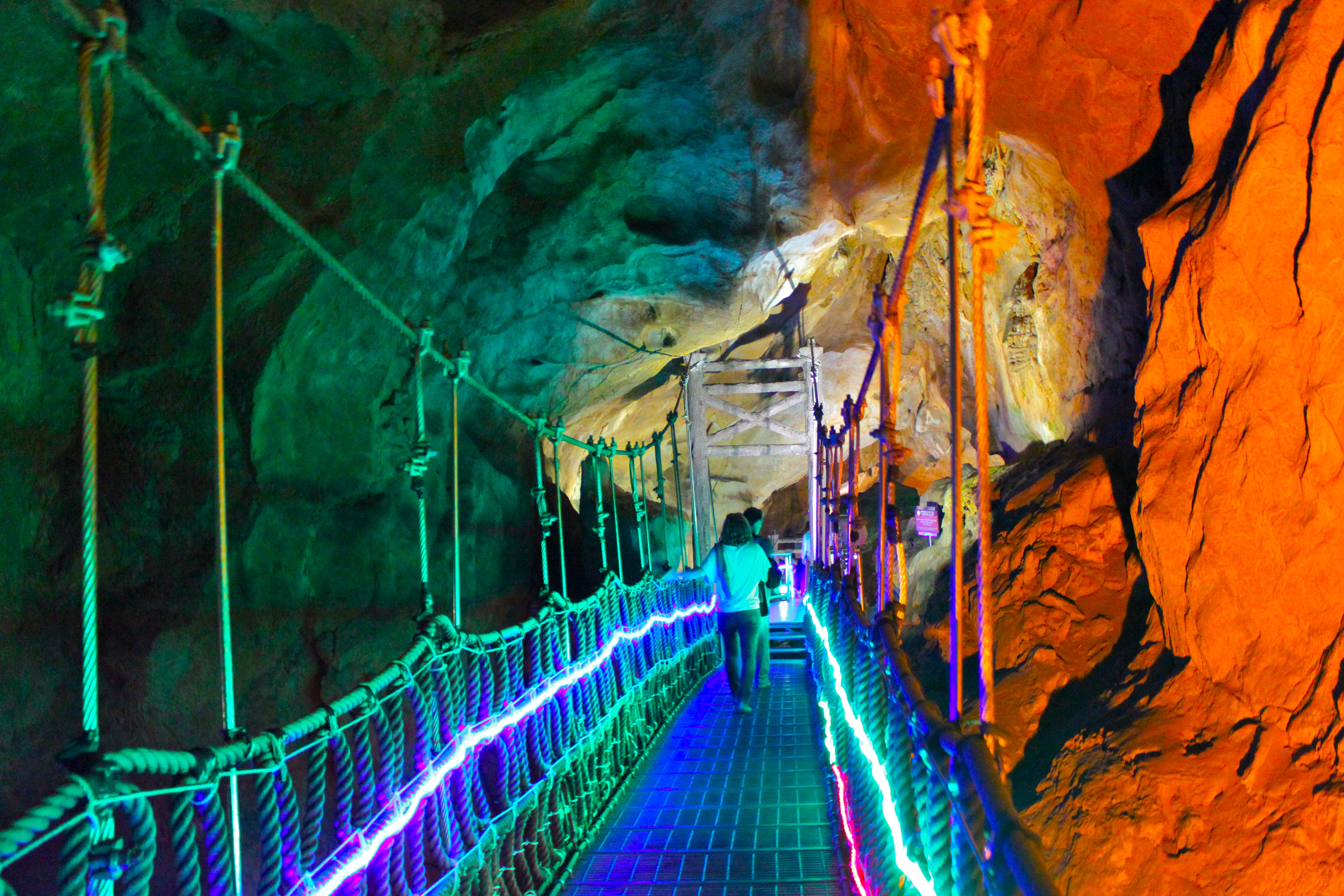 This week’s Snapshot Sunday comes from Hwanseon Cave in Gangwon-do, Korea. Hwanseon Cave is one of the largest limestone caves in Asia with about 6.2 km of known passages. Visitors can tour about 1.6 km of them which have been lit with colorful lights. This is Lover’s Walk, a suspension bridge across a particularly tall portion of the cave.