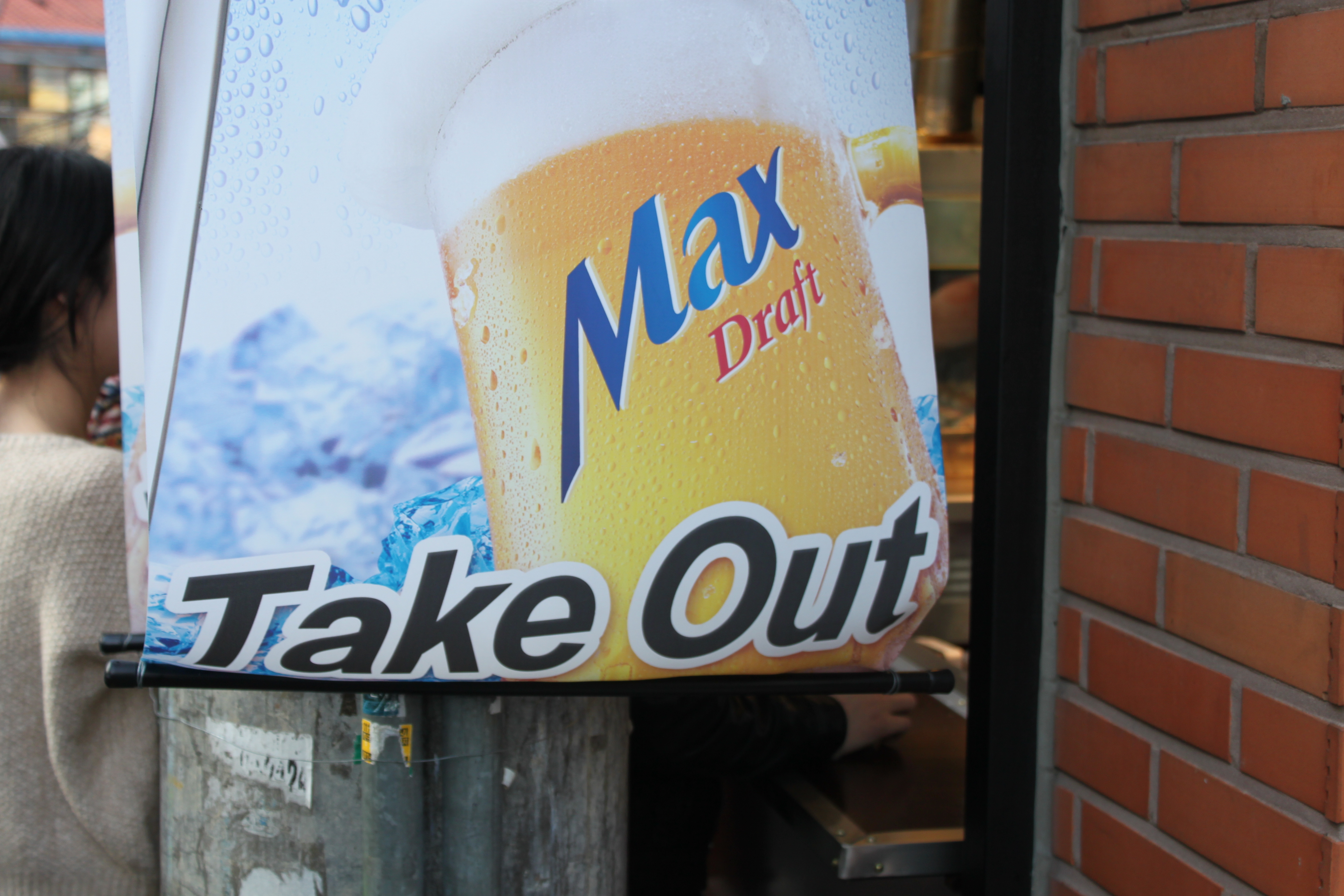 Next up was dakkochi, or chicken skewers. To make dakkochi, chicken, peppers, and onions are lined up on a long stick, grilled, and then slathered with sauce. We went with the spicy option and got some take away beers to take away the burn. You’ve got to love a country that does take away beers!