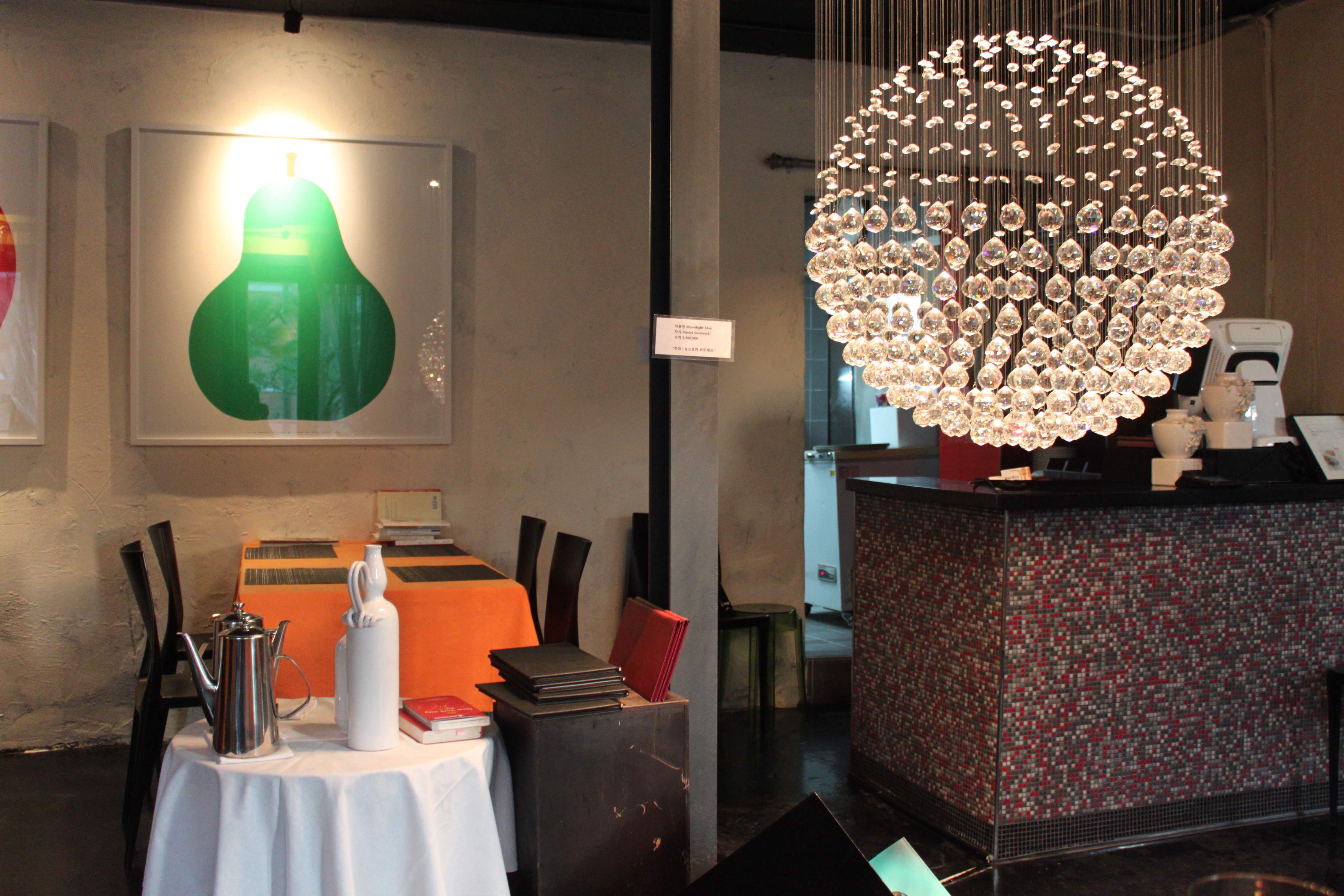 Still feeling hungry, we walked over to Bukchon-ro intending on having dinner and some wine. We found an Italian restaurant, on the second floor, and decided to check it out. The place was very modern- with a big, glass chandelier hanging down in the middle and was decorated with pieces from local artists.