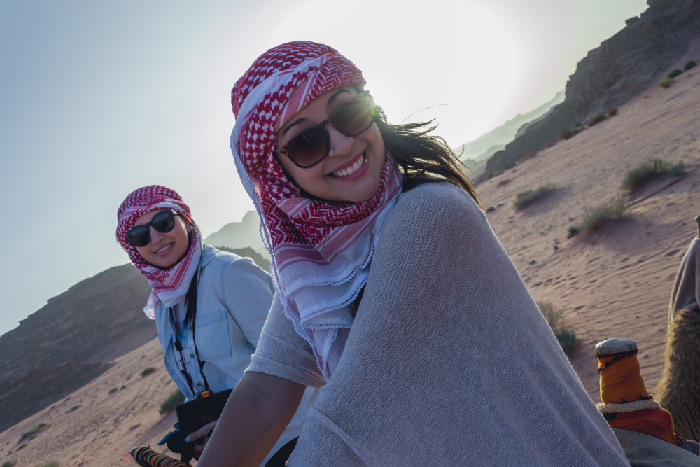 And it didn’t disappoint. We rolled up to Captain’s Camp, a posh camp site run by local Bedouins, and immediately upon stepping out of the can I had a man tying a shemagh mhadab around my head. While traditionally worn by men, this checkered scarf would provide good protection against the wind and sand in the desert. (And when I walked out in mine it was pronounced that I looked “full Arab”.)